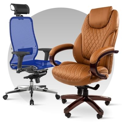 У компьютерных кресел этой группы подлокотники и пятилучия чаще всего изготовлены из хромированного металла или массива дерева. В обивке в основном используются экокожа и натуральная кожа. Кресла оснащаются различными модификациями синхро механизмов качания.
